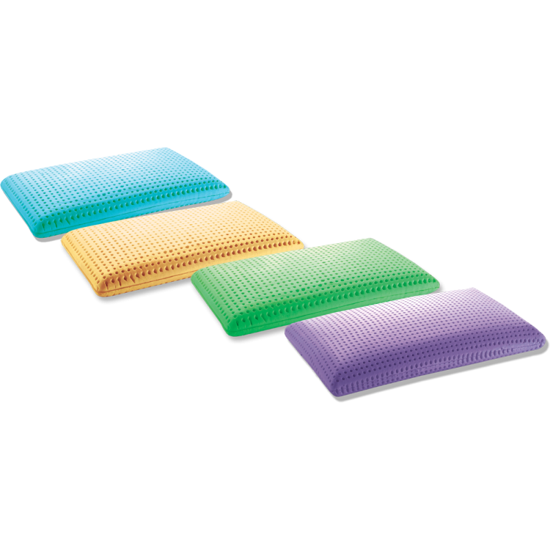Guanciali colorati AROMATIZZATI in Memory Foam a stampo, con fori passanti di aerazione, foderina in Stretch in tema, sotto-foderina in microfibra con cerniera.