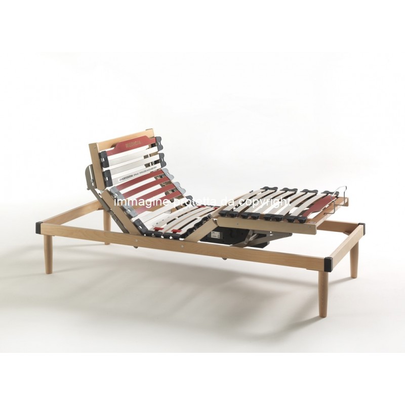 Rete Legno Telaio 70x25 in multistrato di faggio, regolatori di rigidità lombari ad anelli con 4 sottodoghe, 26 doghe multistrato 38x8, inserti in SEBS. Piedi diametro 70 mm. Angolari in fibra di vetro.
