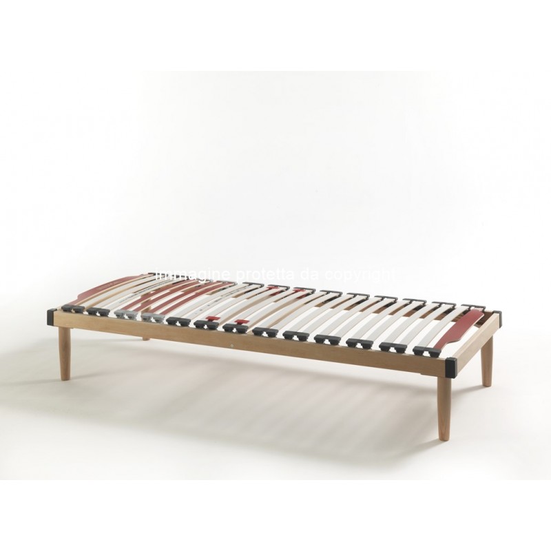 Rete Legno Telaio 70x25 in multistrato di faggio, regolatori di rigidità lombari ad anelli con 4 sottodoghe, 26 doghe multistrato 38x8, inserti in SEBS. Piedi diametro 70 mm. Angolari in fibra di vetro.