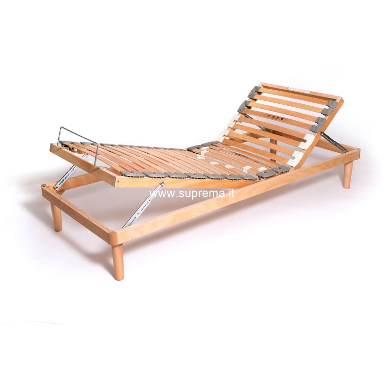 Rete Legno Telaio 60x30 in multistrato di faggio, regolatori di rigidità lombari ad anelli con 4 sottodoghe, 26 doghe multistrato 38x8 angolari in nylon, inserti in SEBS. Piedi conici diametro 55 mm.