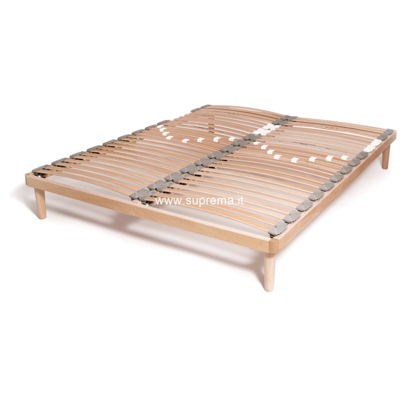Rete Legno Telaio 60x30 in multistrato di faggio, regolatori di rigidità lombari ad anelli con 4 sottodoghe, 26 doghe multistrato 38x8 angolari in nylon, inserti in SEBS. Piedi conici diametro 55 mm.