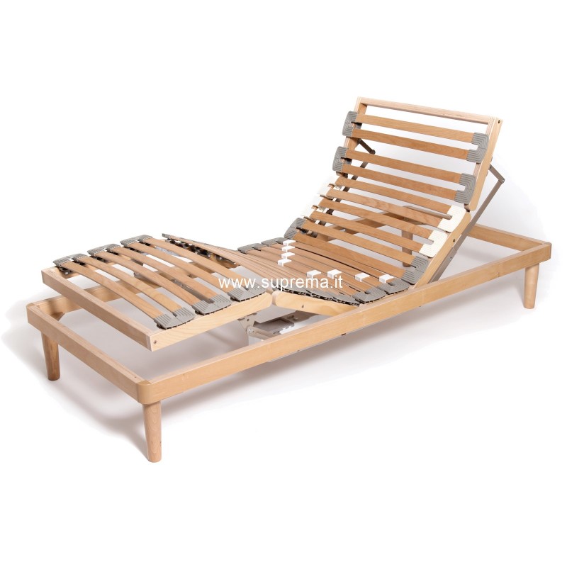 Rete Legno Telaio 60x30 in multistrato di faggio, regolatori di rigidità lombari ad anelli con 4 sottodoghe, 26 doghe multistrato 38x8 angolari in nylon, inserti in SEBS. Piedi conici diametro 55 mm.
